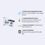 62% relative Luftfeuchtigkeit ist der internationale Gold-Standard für die Lagerung von Cannabis und Kräutern. Bei dieser Feuchtigkeit bleiben deine Blüten perfekt konserviert: Sie sind weder zu trocken (was Terpene zerstört und die Konsistenz brüchig macht) noch zu feucht (was Schimmel begünstigt). 62% RH sorgt für die ideale Klebrigkeit beim Zerkleinern, erhält die natürlichen Aromen und schützt gleichzeitig vor mikrobiellem Wachstum.